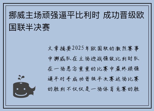 文章摘要:2025年欧国联的激烈赛事中,挪威队在主场迎战强敌比利时队,在一场悬念重重的比赛中最终顽强逼平对手,成功晋级半决赛。这场比赛的胜利不仅仅是一场体育竞赛的胜利,更是对挪威足球团队精神和坚韧不拔战斗力的完美诠释。比赛的转折点、战术布置...
