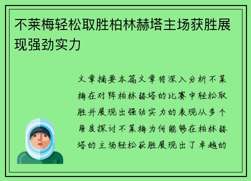 文章摘要:本篇文章将深入分析不莱梅在对阵柏林赫塔的比赛中轻松取胜并展现出强劲实力的表现。从多个角度探讨不莱梅为何能够在柏林赫塔的主场轻松获胜,展现出了卓越的竞技状态和团队合作精神。首先,从球队整体战术的执行角度来分析,球队如何通过高效的攻守...