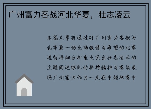 本篇文章将通过对广州富力客战河北华夏一场充满激情与希望的比赛进行详细分析,重点突出“壮志凌云”的主题,阐述球队的拼搏精神与赛场表现。广州富力作为一支在中超联赛中不容忽视的球队,常常展现出顽强的意志力和雄心壮志。河北华夏则同样具有强烈的竞争力...