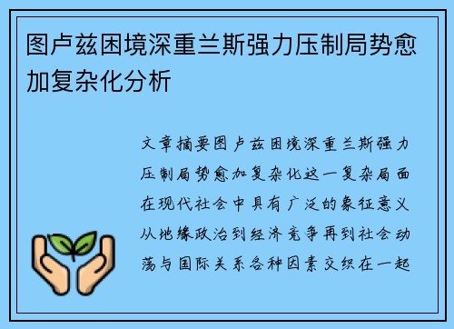 文章摘要:图卢兹困境深重兰斯强力压制局势愈加复杂化,这一复杂局面在现代社会中具有广泛的象征意义。从地缘政治到经济竞争,再到社会动荡与国际关系,各种因素交织在一起,形成了一个高度紧张的状态。本文通过四个方面对这一复杂局势进行详细分析:首先,图...