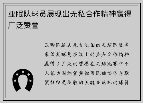 亚眠队球员展现出无私合作精神赢得广泛赞誉