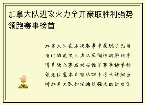 加拿大队进攻火力全开豪取胜利强势领跑赛事榜首