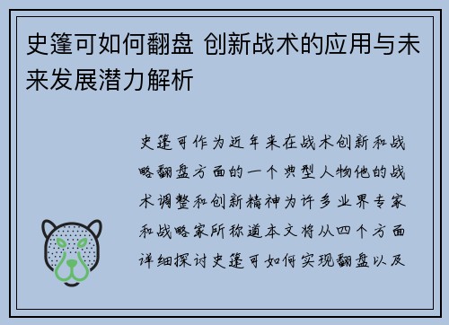 史篷可如何翻盘 创新战术的应用与未来发展潜力解析