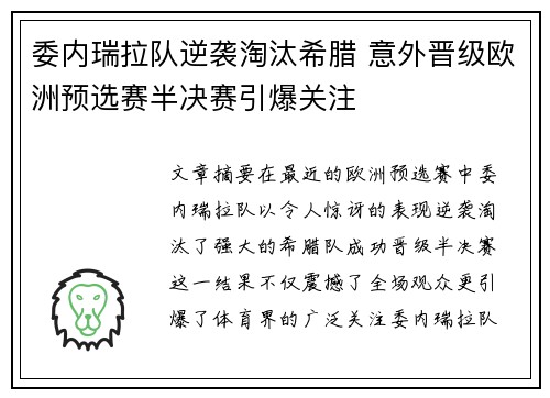 委内瑞拉队逆袭淘汰希腊 意外晋级欧洲预选赛半决赛引爆关注