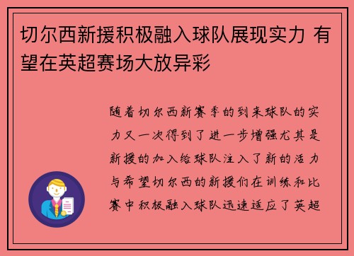 切尔西新援积极融入球队展现实力 有望在英超赛场大放异彩