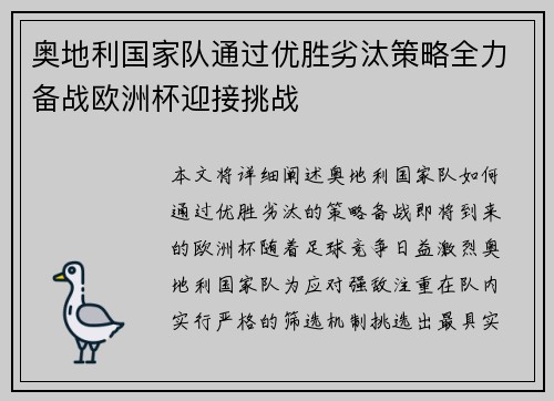 本文将详细阐述奥地利国家队如何通过优胜劣汰的策略,备战即将到来的欧洲杯。随着足球竞争日益激烈,奥地利国家队为应对强敌,注重在队内实行严格的筛选机制,挑选出最具实力的球员加入阵容。本文将从四个方面展开:一是优胜劣汰的筛选机制,二是战术体系的调...