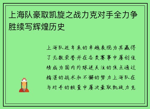 上海队豪取凯旋之战力克对手全力争胜续写辉煌历史