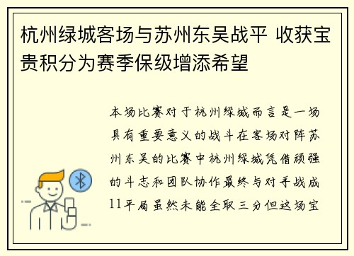 杭州绿城客场与苏州东吴战平 收获宝贵积分为赛季保级增添希望