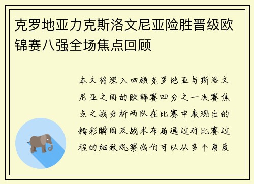 克罗地亚力克斯洛文尼亚险胜晋级欧锦赛八强全场焦点回顾