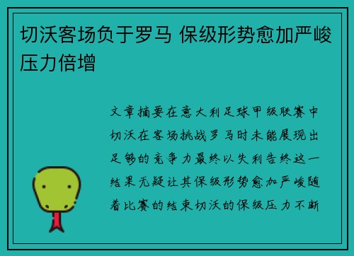 切沃客场负于罗马 保级形势愈加严峻压力倍增