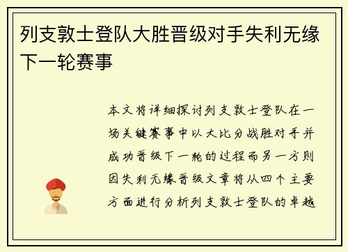 本文将详细探讨列支敦士登队在一场关键赛事中以大比分战胜对手,并成功晋级下一轮的过程,而另一方则因失利无缘晋级。文章将从四个主要方面进行分析:列支敦士登队的卓越表现、对手的失误与不足、赛事中的关键转折点、以及未来展望与对这场比赛的影响。通过这...