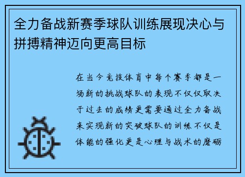 在当今竞技体育中,每个赛季都是一场新的挑战,球队的表现不仅仅取决于过去的成绩,更需要通过全力备战来实现新的突破。球队的训练不仅是体能的强化,更是心理与战术的磨砺。为了迈向更高的目标,球队必须展现出坚定的决心和拼搏的精神。这篇文章将从四个方面...