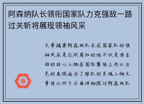阿森纳队长领衔国家队力克强敌一路过关斩将展现领袖风采