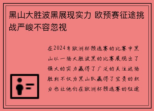 黑山大胜波黑展现实力 欧预赛征途挑战严峻不容忽视