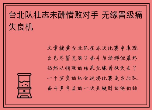 台北队壮志未酬惜败对手 无缘晋级痛失良机