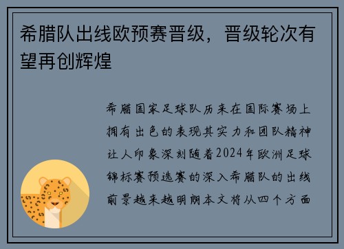 希腊队出线欧预赛晋级,晋级轮次有望再创辉煌