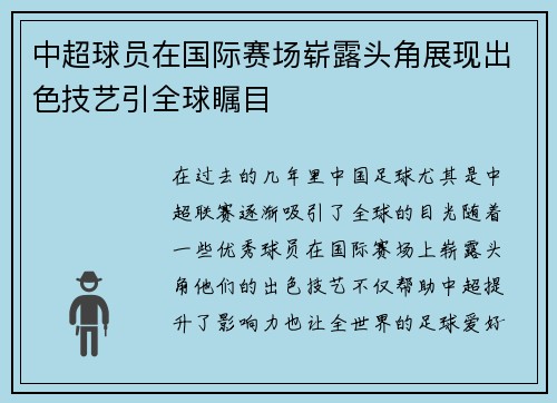 中超球员在国际赛场崭露头角展现出色技艺引全球瞩目