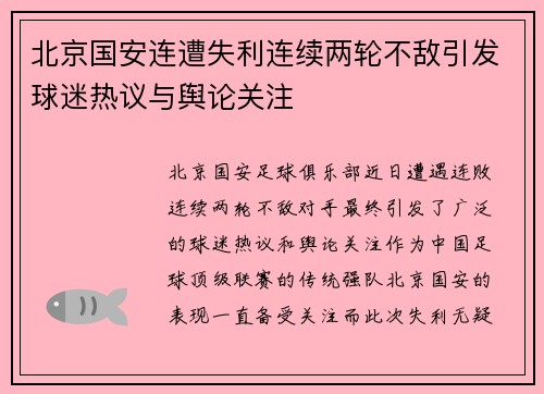 北京国安连遭失利连续两轮不敌引发球迷热议与舆论关注