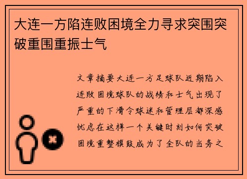 大连一方陷连败困境全力寻求突围突破重围重振士气