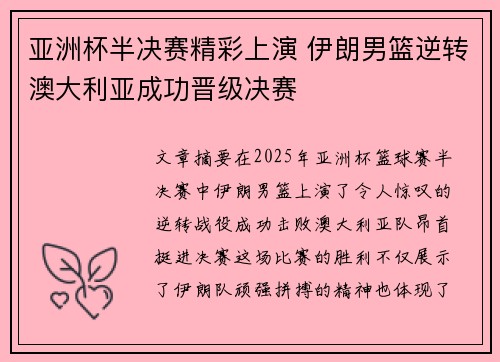 文章摘要:在2025年亚洲杯篮球赛半决赛中,伊朗男篮上演了令人惊叹的逆转战役,成功击败澳大利亚队,昂首挺进决赛。这场比赛的胜利不仅展示了伊朗队顽强拼搏的精神,也体现了球队战术上的灵活性与临场应变的能力。伊朗男篮在比赛过程中经历了多次落后,尤...