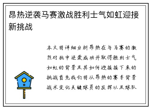 昂热逆袭马赛激战胜利士气如虹迎接新挑战