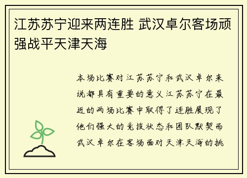江苏苏宁迎来两连胜 武汉卓尔客场顽强战平天津天海