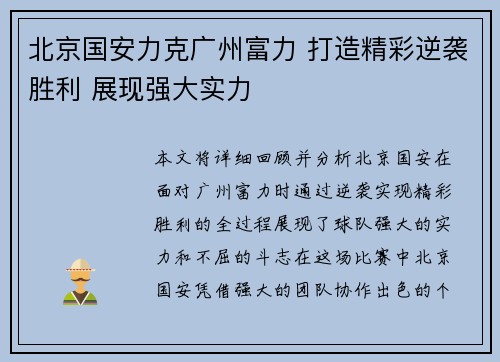 本文将详细回顾并分析北京国安在面对广州富力时,通过逆袭实现精彩胜利的全过程,展现了球队强大的实力和不屈的斗志。在这场比赛中,北京国安凭借强大的团队协作、出色的个人表现以及坚韧的比赛精神,在落后的情况下成功逆转,最终以胜利告终。文章将从四个方...