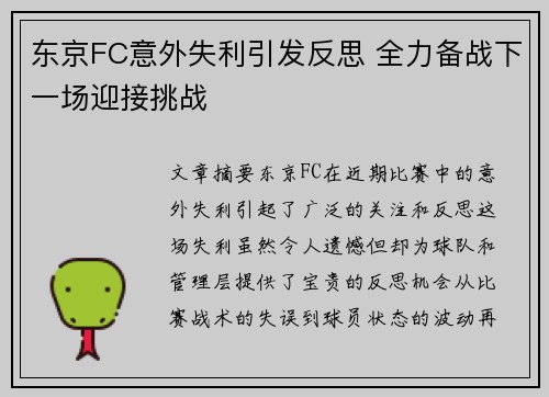 文章摘要:东京FC在近期比赛中的意外失利引起了广泛的关注和反思。这场失利虽然令人遗憾,但却为球队和管理层提供了宝贵的反思机会。从比赛战术的失误到球员状态的波动,再到心理素质的考验,每一方面都值得球队认真总结。这篇文章将围绕东京FC失利的原因...