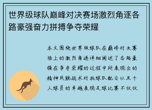 世界级球队巅峰对决赛场激烈角逐各路豪强奋力拼搏争夺荣耀
