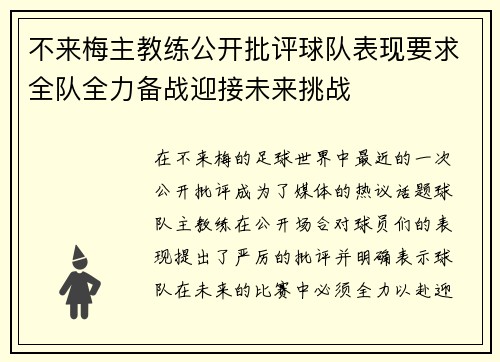 不来梅主教练公开批评球队表现要求全队全力备战迎接未来挑战