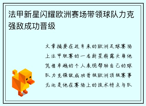 法甲新星闪耀欧洲赛场带领球队力克强敌成功晋级
