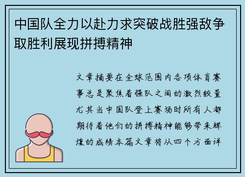文章摘要:在全球范围内,各项体育赛事总是聚焦着强队之间的激烈较量,尤其当中国队登上赛场时,所有人都期待着他们的拼搏精神能够带来辉煌的成绩。本篇文章将从四个方面详细阐述中国队如何全力以赴,力求突破,战胜强敌,争取胜利,并展现出顽强拼搏的精神。...