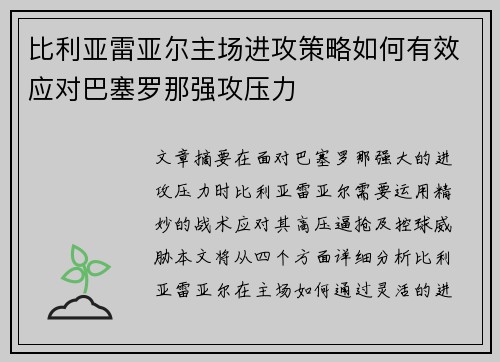 文章摘要:在面对巴塞罗那强大的进攻压力时,比利亚雷亚尔需要运用精妙的战术应对其高压逼抢及控球威胁。本文将从四个方面详细分析比利亚雷亚尔在主场如何通过灵活的进攻策略有效应对巴萨的攻势。首先,通过战术布置上的调整,创造宽度与深度,避免巴萨的高位...