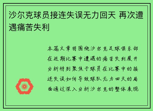 本篇文章将围绕沙尔克足球俱乐部在近期比赛中遭遇的痛苦失利展开分析,特别聚焦于球员在比赛中的接连失误,如何导致球队无力回天的局面。通过深入分析沙尔克的整体表现,我们将从球员个人失误、团队协作失衡、防守漏洞、心理状态等四个方面进行详细阐述。这些...