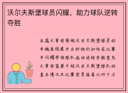 本篇文章将围绕沃尔夫斯堡球员的卓越表现展开,分析他们如何在比赛中闪耀,带领球队成功逆转夺胜。首先,文章将简要介绍沃尔夫斯堡球队的基本情况及比赛背景,接着从四个方面深入剖析球员们的关键表现,包括个人技术的突破、团队协作的默契、比赛中的心理调整...