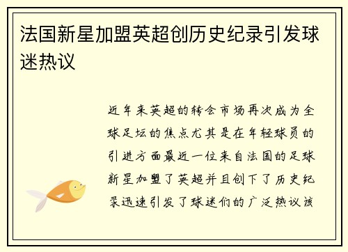 近年来,英超的转会市场再次成为全球足坛的焦点,尤其是在年轻球员的引进方面。最近,一位来自法国的足球新星加盟了英超,并且创下了历史纪录,迅速引发了球迷们的广泛热议。该球员不仅在技术、潜力以及成长空间上被看作是未来的巨星,还在转会过程中打破了多...