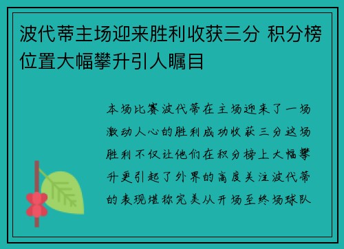 波代蒂主场迎来胜利收获三分 积分榜位置大幅攀升引人瞩目