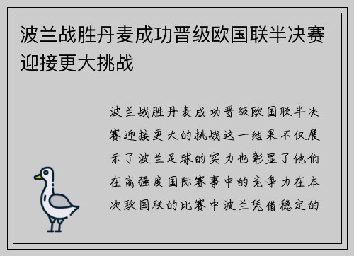 波兰战胜丹麦成功晋级欧国联半决赛,迎接更大的挑战。这一结果不仅展示了波兰足球的实力,也彰显了他们在高强度国际赛事中的竞争力。在本次欧国联的比赛中,波兰凭借稳定的战术布置、出色的个人表现以及强大的团队凝聚力,成功突破了丹麦的防线,获得了宝贵的...
