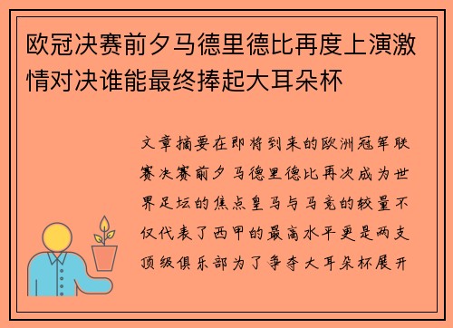 欧冠决赛前夕马德里德比再度上演激情对决谁能最终捧起大耳朵杯