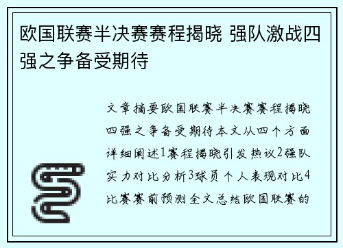 文章摘要:欧国联赛半决赛赛程揭晓,四强之争备受期待。本文从四个方面详细阐述:1、赛程揭晓引发热议;2、强队实力对比分析;3、球员个人表现对比;4、比赛赛前预测。全文总结欧国联赛的激烈竞争,球迷期待的情绪高涨。1、赛程揭晓引发热议观众们对欧国...