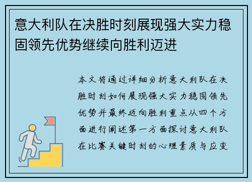 本文将通过详细分析意大利队在决胜时刻如何展现强大实力、稳固领先优势并最终迈向胜利,重点从四个方面进行阐述。第一方面探讨意大利队在比赛关键时刻的心理素质与应变能力,如何通过冷静决策克服压力;第二方面将分析意大利队在战术执行中的精准与高效,如何...