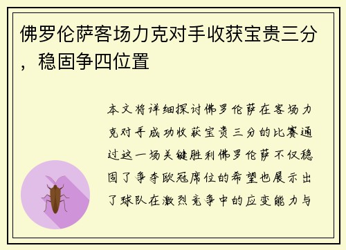 本文将详细探讨佛罗伦萨在客场力克对手,成功收获宝贵三分的比赛,通过这一场关键胜利,佛罗伦萨不仅稳固了争夺欧冠席位的希望,也展示出了球队在激烈竞争中的应变能力与坚韧不拔的战斗精神。本文将从四个方面进行详细分析:一是球队在客场比赛中的表现;二是...