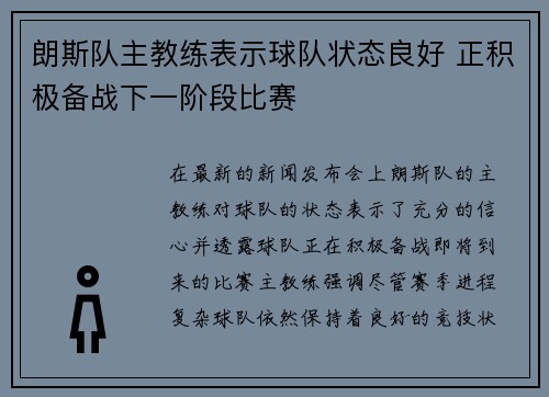 朗斯队主教练表示球队状态良好 正积极备战下一阶段比赛