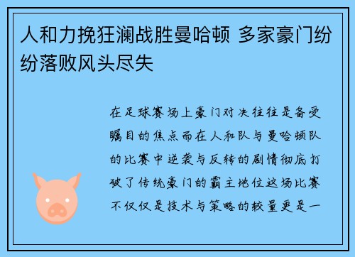 人和力挽狂澜战胜曼哈顿 多家豪门纷纷落败风头尽失