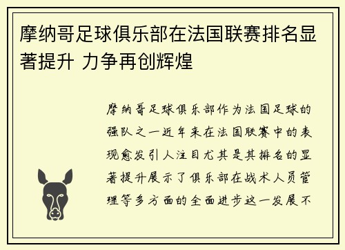 摩纳哥足球俱乐部在法国联赛排名显著提升 力争再创辉煌