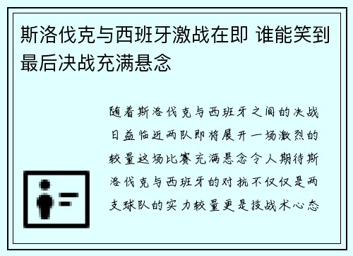 随着斯洛伐克与西班牙之间的决战日益临近,两队即将展开一场激烈的较量,这场比赛充满悬念,令人期待。斯洛伐克与西班牙的对抗不仅仅是两支球队的实力较量,更是技战术、心态、以及历史背景等多方面因素的交织。西班牙以其深厚的足球文化和强大的整体实力闻名...