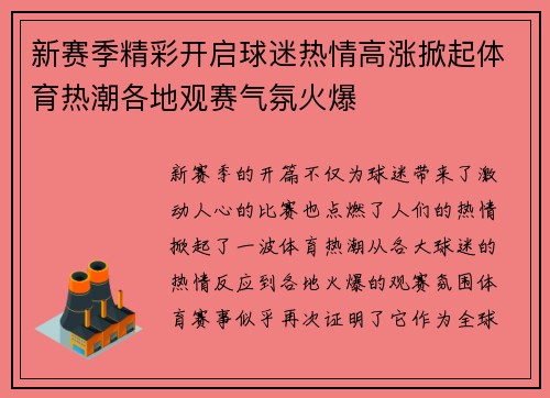 新赛季精彩开启球迷热情高涨掀起体育热潮各地观赛气氛火爆