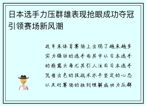 日本选手力压群雄表现抢眼成功夺冠引领赛场新风潮