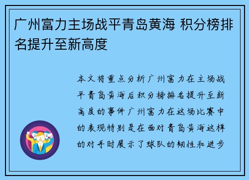 本文将重点分析广州富力在主场战平青岛黄海后,积分榜排名提升至新高度的事件。广州富力在这场比赛中的表现,特别是在面对青岛黄海这样的对手时,展示了球队的韧性和进步。本文将从四个方面进行详细阐述,分析这场比赛对广州富力的意义,以及他们如何通过这场...
