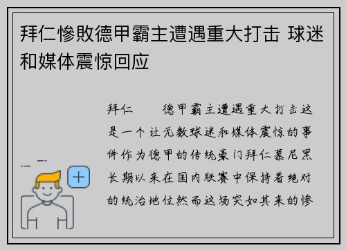 拜仁慘敗,德甲霸主遭遇重大打击,这是一个让无数球迷和媒体震惊的事件。作为德甲的传统豪门,拜仁慕尼黑长期以来在国内联赛中保持着绝对的统治地位。然而,这场突如其来的惨败不仅令球迷们感到措手不及,也让媒体对球队未来的前景产生了深刻的担忧。本文将从...